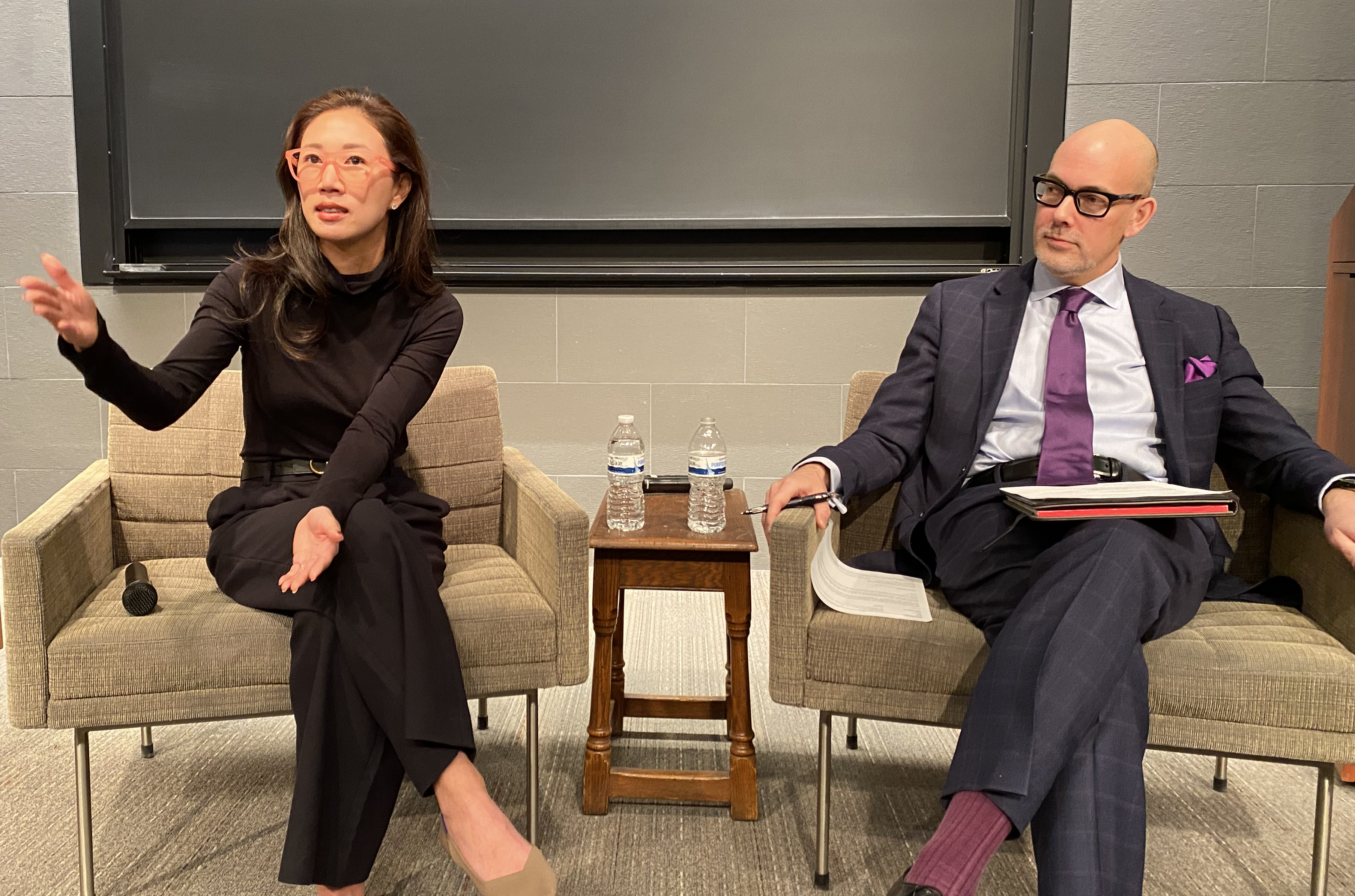 On November 20, Cornell Law School commemorated the 80th anniversary of the Nuremberg Trials on November 20 with a wide-ranging fireside chat on the continuing relevance of international criminal law amid today’s geopolitical challenges. Held in Room 182 of Myron Taylor Hall, the discussion featured Allan R. Tessler Dean and Professor of Law Jens David Ohlin and Jessica Kim, Distinguished Practitioner in Residence and Rule of Law Fellow, whose career in the U.S. Department of Justice included serving as the U.S. Special Prosecutor for the Crime of Aggression.