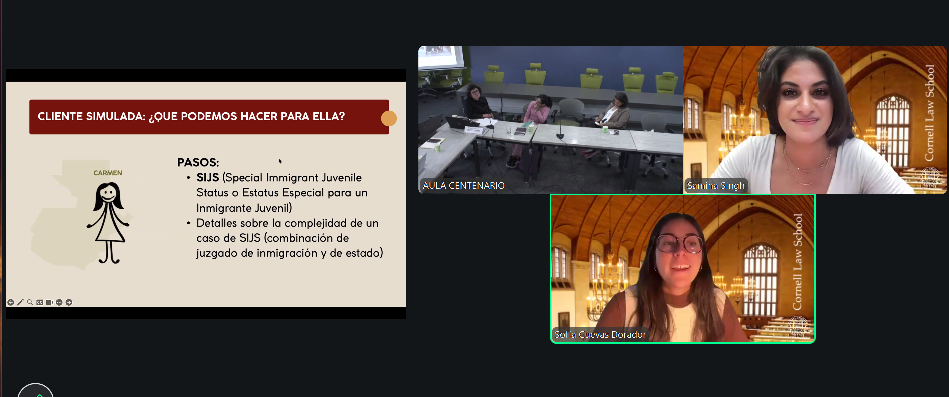 For me, it was invaluable to work alongside Sofía. While I am new to the work and full of excitement about the opportunity to learn law beyond the classroom, invigorated by my initial experiences working directly with a client this semester, Sofía brought in-depth knowledge about the details and extensive clinical experience. I was able to use my eye for design in developing slides to showcase our mock client’s story. Together, I think our experiences complemented one another and left me feeling inspired that hopefully soon I, too, might be able to speak with as much confidence, clarity, and expertise as Sofía did!