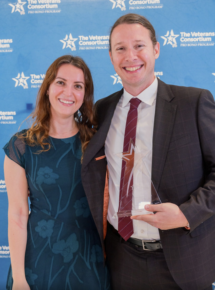 Launched in Fall 2023, the Veterans Law Practicum was born out of student initiative and vision. Fifth-year associate and Army JAG Reservist Logan Kenney ’21 (now with Wilkie Farr’s D.C. office) first recognized the need for a veterans law clinic at Cornell Law. Though unable to get approval during her time at the law school, Kenney entrusted the idea to a group of five student veterans from the Class of 2024. Among them was Patrick George, a fourteen-year Air Force veteran, current Air Force Reservist, and now a second-year associate at Latham & Watkins in Washington, D.C. Together, they successfully secured approval from Dean Ohlin for what was intended to be a one-semester pilot. Instead, they built enough momentum to establish a permanent program. Both Kenney and George joined Veterans Law Practicum Director Jimmy Hardwick at the awards ceremony in Washington to celebrate the program’s recognition by The Veterans Consortium.